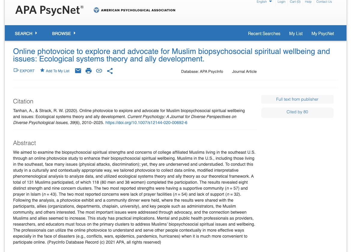 Title: Online Photovoice to Explore and Advocate for Muslim Biopsychosocial Spiritual Wellbeing and Issues: Ecological Systems Theory and Ally Development (2020)